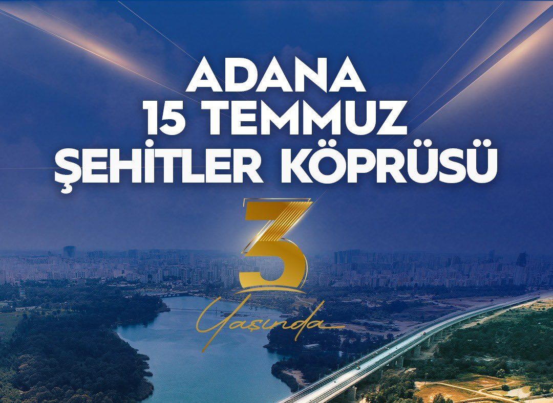 “Adana’nın iki yakasını buluşturan gurur eserimiz 3 yaşında! 15 Temmuz Şehitler Köprüsü; açıldığı günden bu yana ulaşımı rahatlatan, ticareti hızlandıran ve şehrin yaşamına değer katan güçlü bir bağlantı oldu. Adana’ya hizmet etmeye, Türkiye’yi daha da ileriye taşımaya kararlılıkla devam ediyoruz.”