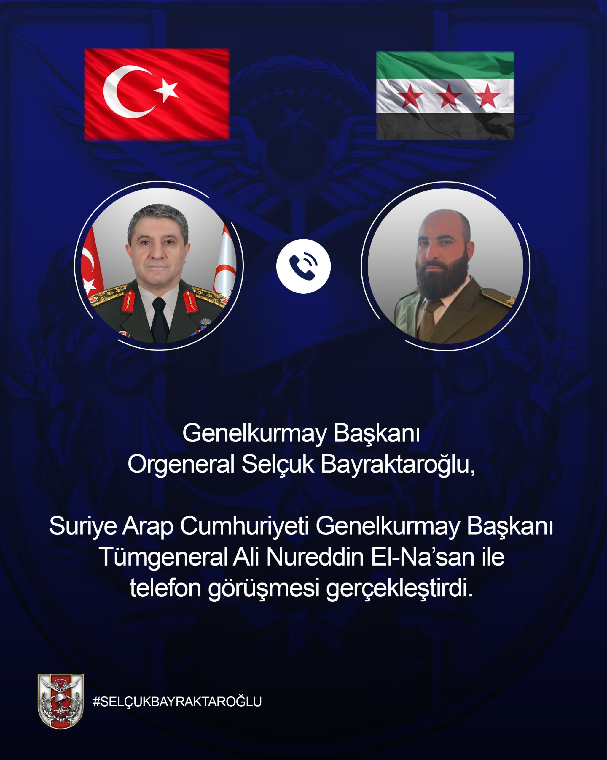 “Genelkurmay Başkanı Orgeneral Selçuk Bayraktaroğlu, Suriye Arap Cumhuriyeti Genelkurmay Başkanı Tümgeneral Ali Nureddin El-Na’san ile telefon görüşmesi gerçekleştirdi. Görüşmede, ikili ilişkiler ve bölgesel konular ele alındı.”