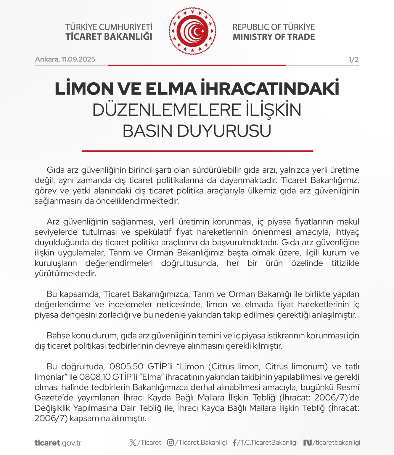 Bakanlık, Tarım ve Orman Bakanlığı ile yapılan değerlendirmeler sonucunda limon ve elma fiyatlarında yaşanan dalgalanmaların iç piyasa dengesini zorladığını ve bu nedenle ihracatın yakından takip edilmesinin zorunlu hale geldiğini açıkladı.