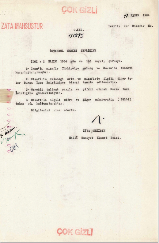 “İranlı misafir Türkiye’ye gelmiş ve Bursa’da ikameti kararlaştırılmıştır. Misafirin kalacağı evin ve misafirle ilgili diğer işler Bursa Yuva Amirliğince bizzat tanzim edilecektir. Gerekli talimat yazılı ve şifahi olarak Bursa Yuva Amirliği’ne gönderilmiştir. Misafirle ilgili şifre ve diğer muhaberatta ‘belli’ takma adı kullanılacaktır. Bilgilerini rica ederim.”